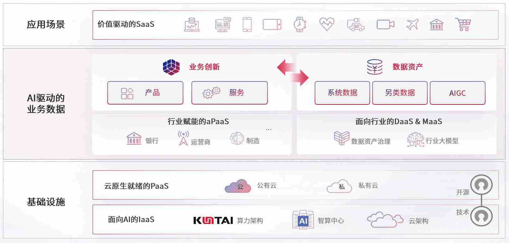 数字时代,,,围绕企业数字化转型的关键要素,,尊龙旗舰厅数码开创性的提出数云融合战略和技术体系框架,,,,着力在云原生、、数字原生、、、、AI原生和信创产业上架构产品和服务能力,,为处在不同数字化转型阶段的快消零售、、、汽车、、金融、、、医疗、、、政企、、、教育、、、、运营商等行业客户提供泛在的敏捷IT能力和融合的数据驱动能力,,,,构建跨界融合创新的数字业务场景和新业务模式,,,,助力企业级客户建立面向未来的核心能力和竞争优势,,,,全面推动社会的数字化、、智能化转型升级。。。。