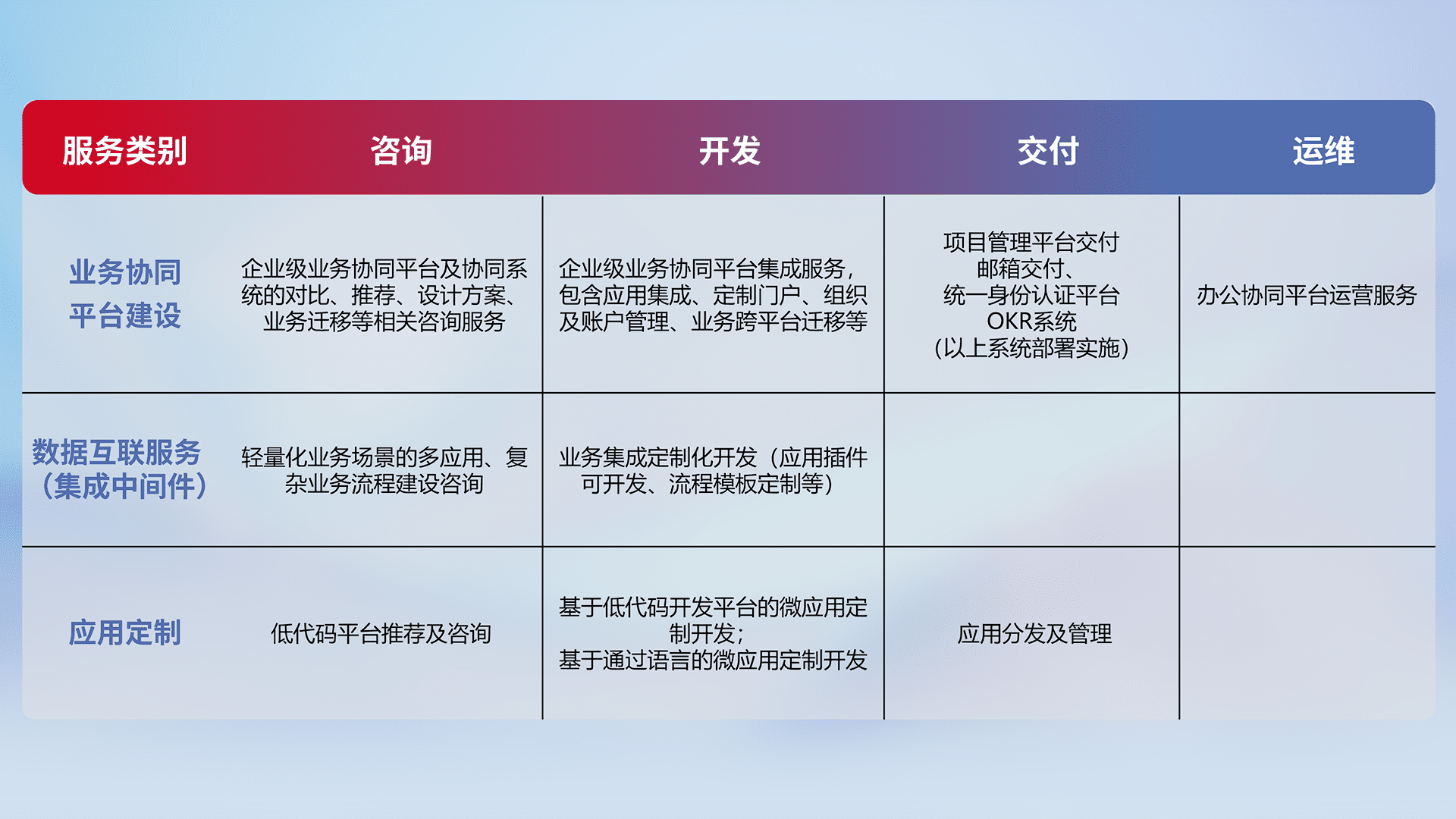 针对钉钉、、、、企微、、IDaas等平台级产品提供产品的规划、、、方案、、、、交付、、定制化开发等服务,,,,实现如统一协同办公、、、智能客户服务、、、、混合会议管理、、智能数据查询、、、等业务场景,,,,实现数字化转型。。。。
